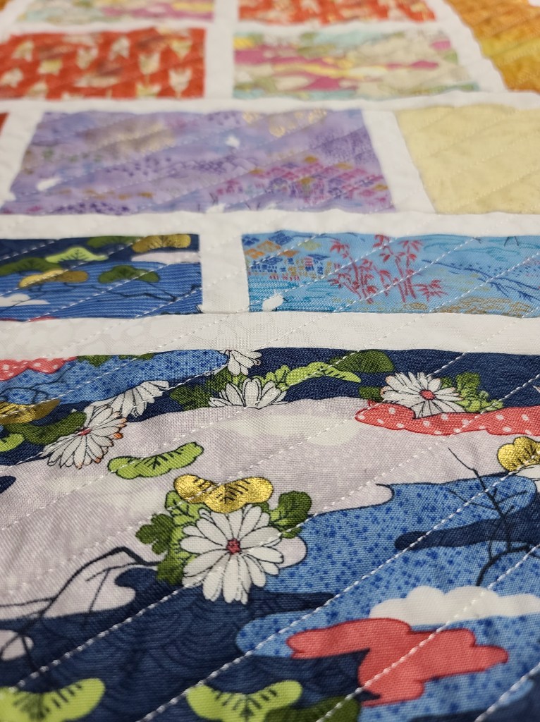 I did straight line quilting. At this point I have learned that you pick an angle that does not correspond with any seams. That way if you are a little off, no one will see it.