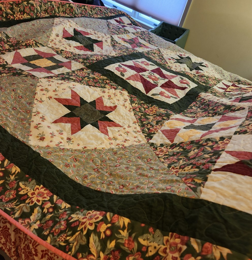 This is my Kite quilt. It came out cute. It has some shirt 3d kite tales. The back has grey fleece, so super soft. This was just me entertaining myself. Nothing special and I did not have anyone in mind when I make it.